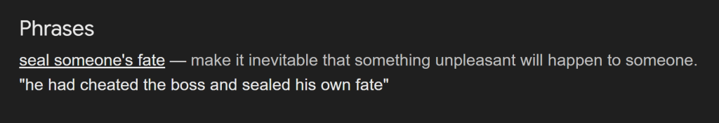 I mean, many people lump fate and death together, and they wouldn’t necessarily be wrong. The word ‘fate’ is related to the word ‘fatal,’ originating from the Latin word fatum, meaning ‘that which has been spoken.’ In the Oxford Dictionary, one of the definitions is “the development of events beyond a person’s control, regarded as determined by a supernatural power,” including the inescapable death of a person. What’s interesting, however, is the definition of ‘sealing one’s fate:’