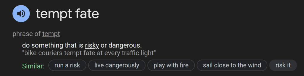 One thing about definitions is it makes things objective, when in reality, words are subjective. That being said, I partly agree with this definition of tempting fate. It definitely correlates with the first example’s notion of one decision, one choice blowing fate and destiny out the window and the third example’s statement that getting in a car with someone with a loaded gun is tempting fate. They both show that taking risks is tempting fate.