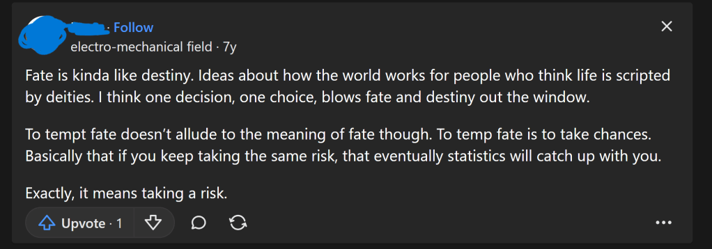 One week at Bible study, one of the girls there said how God gave us free will, that what my husband said wasn’t 100% true. I started getting on board with what my husband was saying, so the girl saying she didn’t agree (even though they’re both Christians) lit a spark of curiosity in me. If fate is something that happens for a reason and will happen regardless of what you do, then can one even tempt fate?