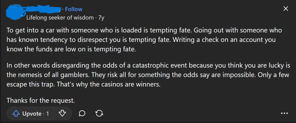 On the topic of luck, this person believes it is “the nemesis of all gamblers.” Just read: