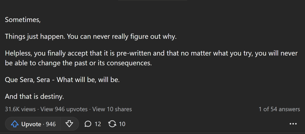 So naturally, I clicked on it. What I found was an interesting addition to the concept of fate. In the first paragraph alone, we get words like ‘jinx’ and ‘superstition.’ This immediately made me think of the phrase: ‘Don’t put that out in the universe.’ That’s something I say anyway. It’s weird to see how superstition one is when it comes to their own fate.