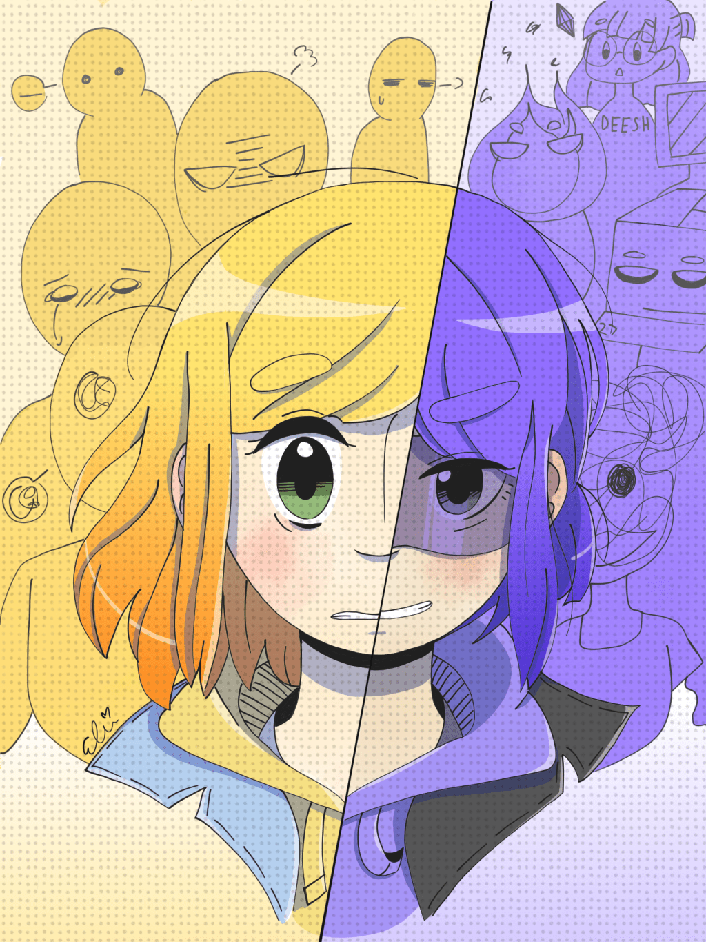 “Elli lives a somewhat normal life. She goes to work, watches her kid, and listens to music. Her life was all fine, till these guys showed up: her alter egos. This comic follows Elli’s daily tasks, as she fights each alter ego that takes control.”